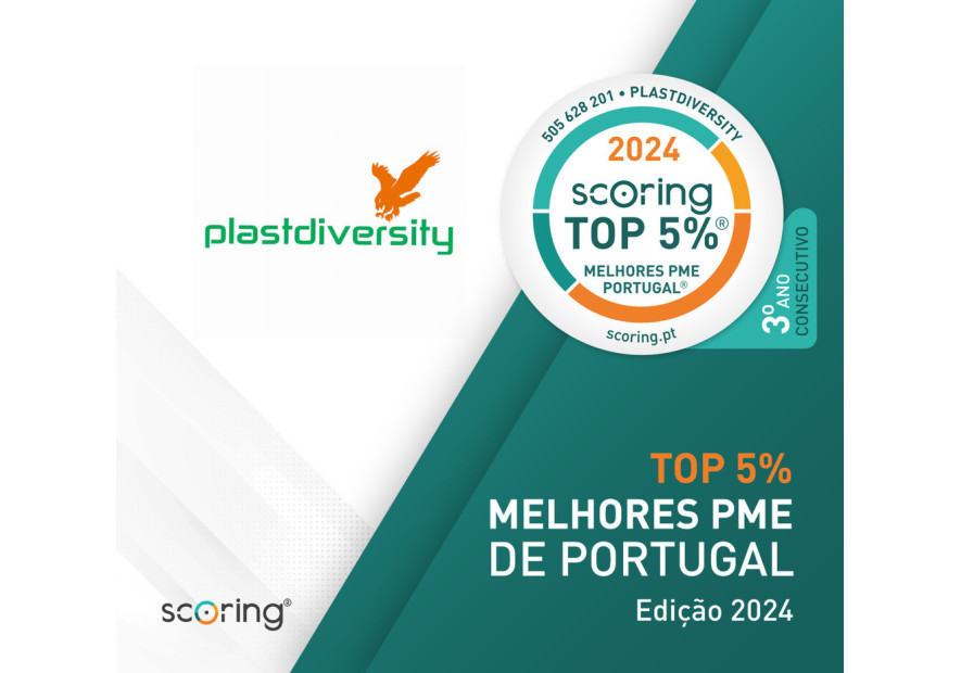 We are proud to announce that Plastdiversity has been awarded the "TOP 5% BEST SMEs IN PORTUGAL" Certification by SCORING for the third consecutive year, in the 2024 edition. This distinction reflects our fulfillment of the strict certification criteria and the achievement of a Performance and Financial Soundness Index exceeding 80%, based on the ScoreSME methodology for the fiscal year 2023.